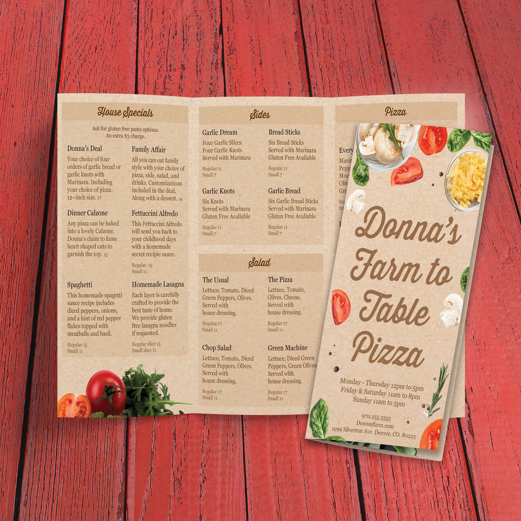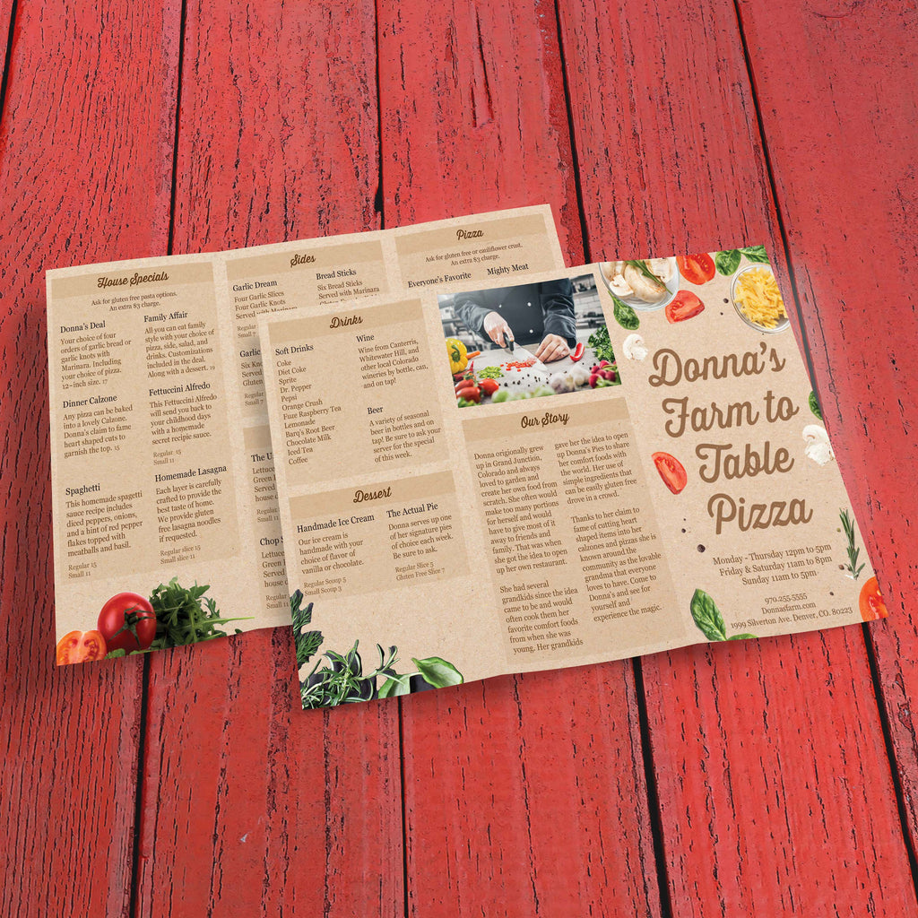 We create each menu template from scratch and design them to give your restaurant a professional look and feel without the expense of paying someone to design your menu. Type in your descriptions and prices exactly how you want them. Then email us the design, and we can get a proof in the mail to you to see in person right away. For free, of course!